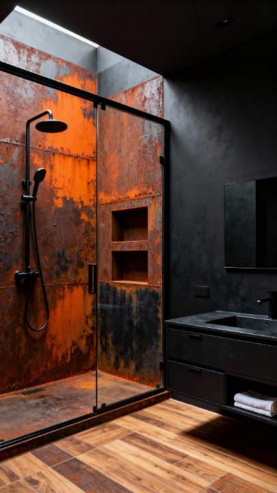 This design takes “industrial chic” to the next level with an incredibly bold choice: a shower enclosure featuring rusty, weathered metal panels! The dark, matte black walls and fixtures frame this vivid, raw orange and black texture dramatically. The lighter wood-look flooring helps to ground the intense palette, creating a powerful, artistic, and undeniably unique space.