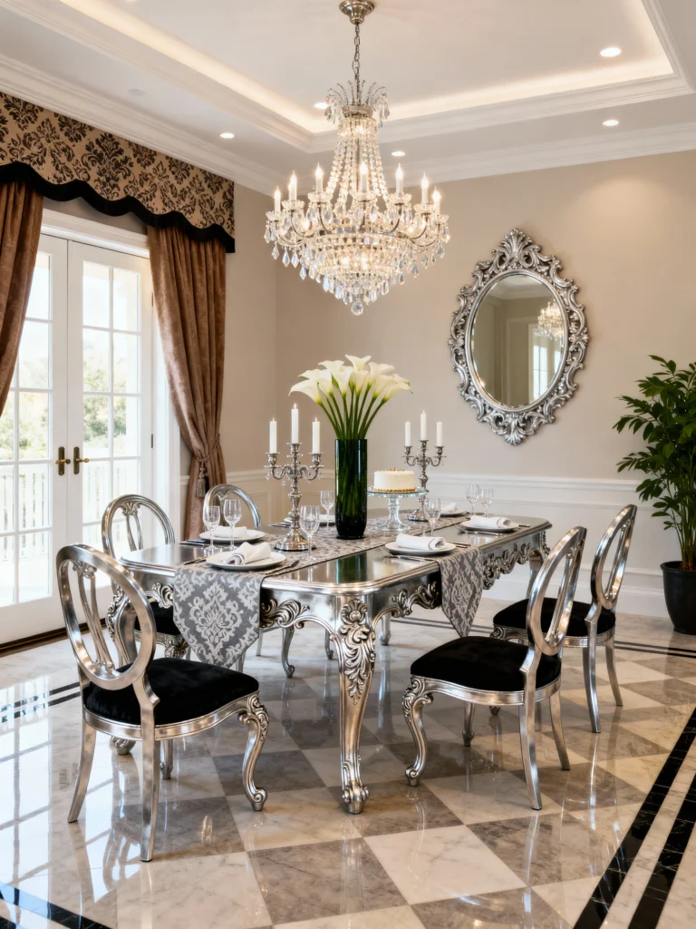 If gold is too “warm” for you, look at this dining room. It’s pure Hollywood Regency meets Neoclassical. That silver-finished dining table is a total showstopper, especially paired with the black velvet chairs. It feels very “Gatsby.” Notice how the marble floor mirrors the pattern of the table runner? It’s those tiny, thoughtful details that take a room from “nice” to “extraordinary.”