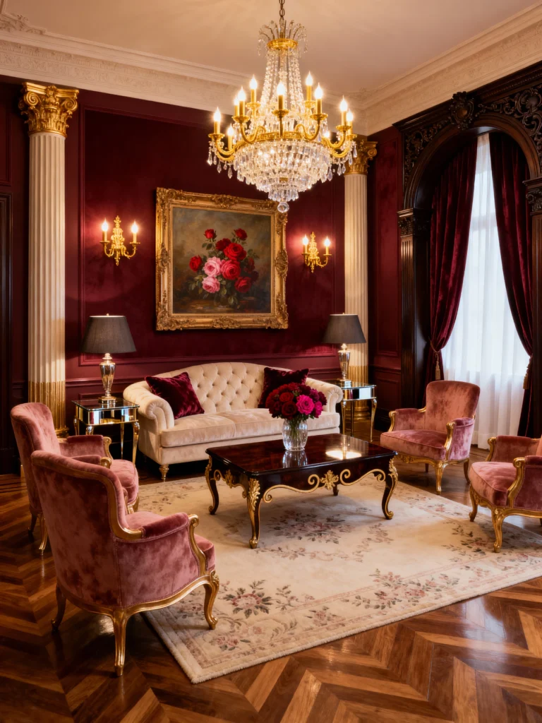 This is the ultimate “moody” room. Those deep burgundy velvet walls are so luxurious! It’s brave to go this dark with color, but because of the high ceilings and the massive crystal chandelier, it doesn’t feel small—it feels like a hug. The cream-colored tufted sofa provides the perfect contrast, ensuring the room stays bright enough to actually enjoy a conversation.