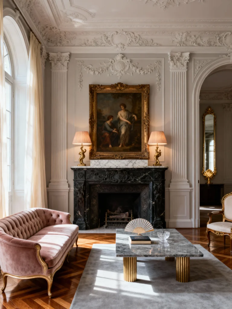 This room is all about the “bones” of the house. Look at that elaborate crown molding and the black marble fireplace! It’s a masterclass in textures: smooth marble, soft pink velvet, and rich chevron wood floors. The low-profile marble coffee table with the gold fluted legs is a modern touch that keeps the room from feeling like a museum. It’s sophisticated, quiet luxury at its best.