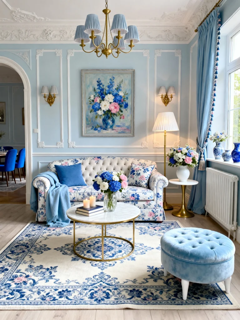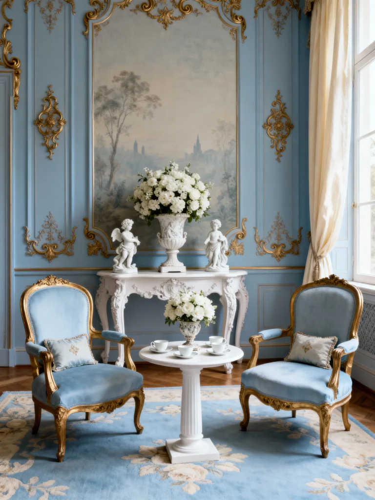 This looks like it belongs in the Palace of Versailles! The sky blue walls with gold filigree are absolutely breathtaking. I love the use of the pedestal table for tea—it’s very dainty. The large wall mural in the background adds so much depth, making the wall feel like a window into another world. It’s feminine, delicate, and undeniably grand.