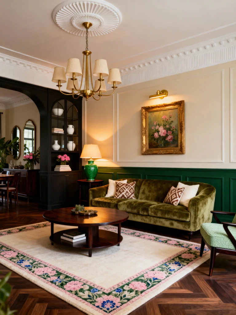 This is how you do a “modern-traditional” mix. The deep emerald green wainscoting at the bottom of the wall adds so much weight and character to the room. It anchors the olive green velvet sofa perfectly. And look at that rug! The pink floral border is such a fun, unexpected contrast to the green walls. It’s quirky, cozy, and very high-fashion.
