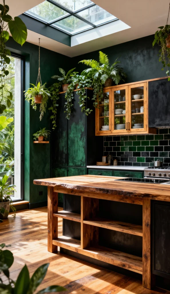 Seriously, stepping into this kitchen must feel like an escape! The mix of deep, textured forest green walls and the raw, live-edge wood island gives off major chic cabin in the jungle vibes. I love how the skylight and the massive window let the natural light flood in, making those hanging plants and the wooden cabinets pop. The dark green subway tile backsplash adds another layer of texture. If you’re looking for a kitchen that feels alive and connected to nature, this is your blueprint!