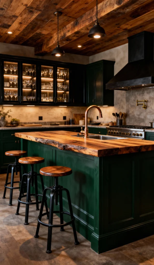 This is elegance with an edge! The dark, almost-black hunter green cabinets paired with the incredibly rich, dark wood ceiling and the stunning live-edge butcher block island create such a cozy, sophisticated atmosphere. Notice the copper faucet—it adds a warm, metallic contrast that is just perfect. And those glass-front cabinets, beautifully lit from within, turn dishware into dazzling decor. It’s the ultimate spot for a late-night chat with a friend over a glass of wine.