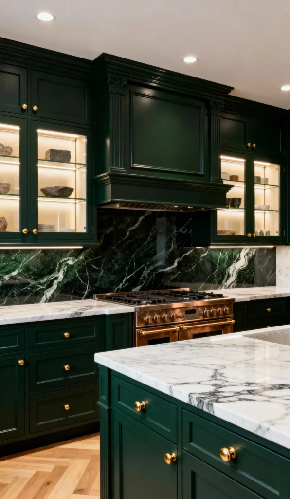 Okay, if you want a kitchen that screams luxury, look no further. This deep emerald green, paired with that show-stopping marble backsplash and countertop (with the incredible veining!), is a total showstopper. The custom range hood detail makes it look like a piece of ornate furniture. And can we talk about that stove? The copper finish on the range is the perfect, unexpected touch of warmth against the cool, dramatic stone. It’s formal, beautiful, and unapologetically glamorous.