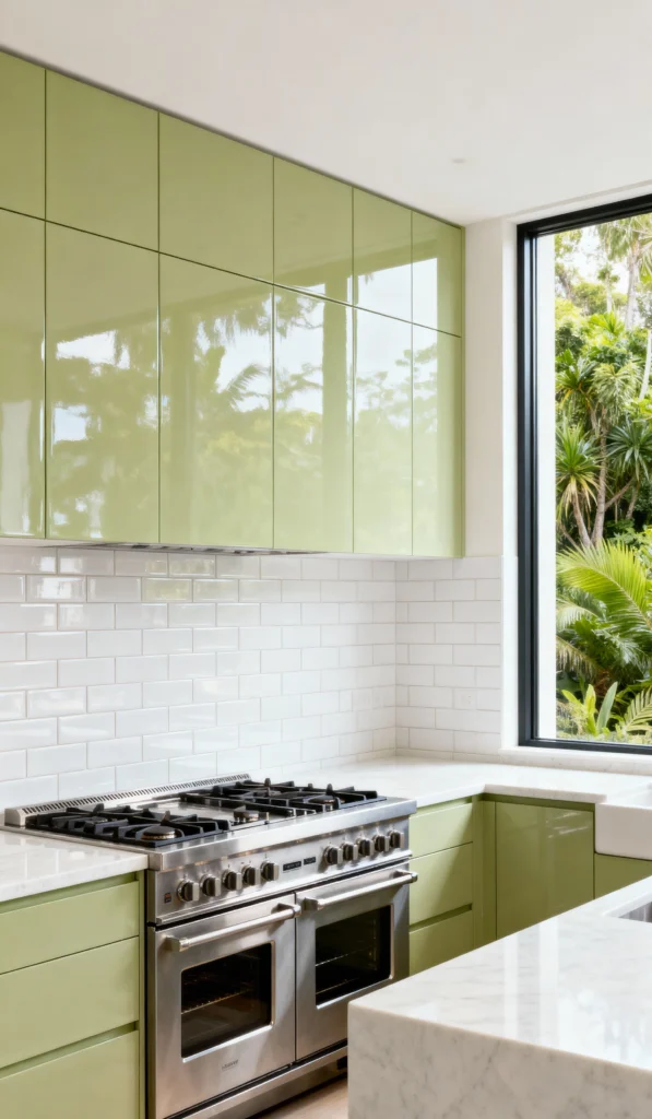 This kitchen proves that green doesn’t have to be dark to be dramatic. The super sleek, high-gloss lime green cabinets are so fun and contemporary, especially next to the classic white subway tile backsplash. The contrast with the huge black window framing the lush, tropical view is fantastic. It’s minimalist, bright, and instantly lifts your mood. This is the perfect color if you want a kitchen that feels energized and ready for anything.