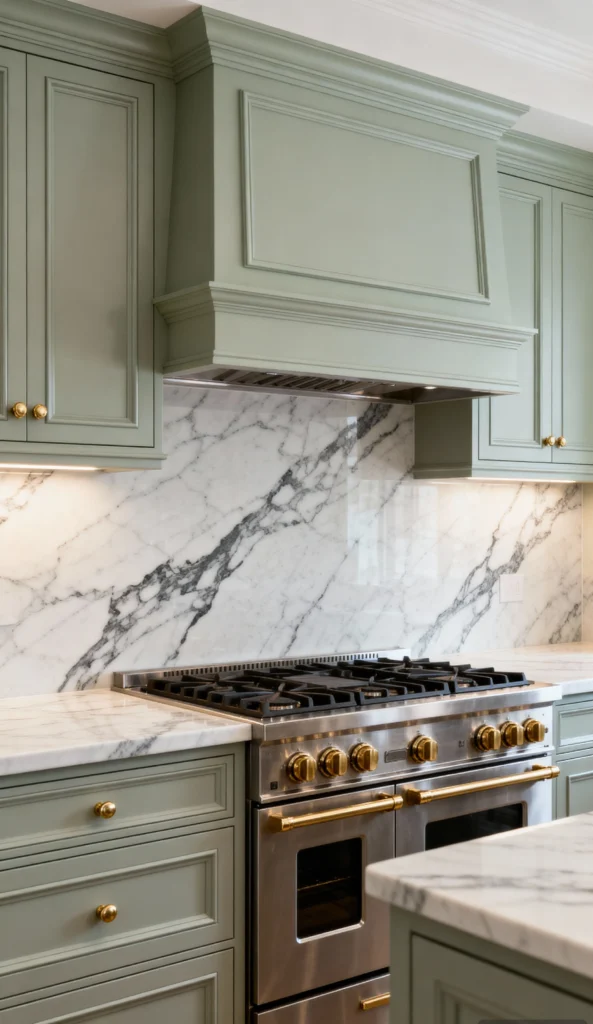 This gorgeous, soft sage green is such a calming color. It’s a fantastic alternative if the deeper greens feel too intense. The cabinetry here has a classic, refined look, and pairing it with the clean white marble that has delicate grey veining keeps the whole space feeling bright and airy. The brass hardware is a timeless choice, adding just a subtle hint of polish and warmth to this beautifully traditional kitchen.