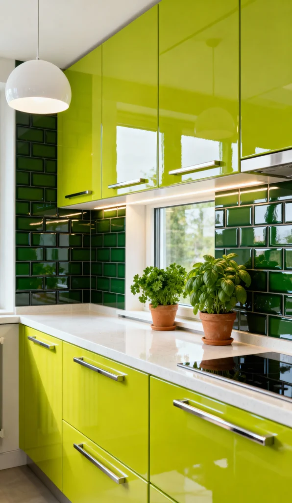 This kitchen is all about bold color and shiny textures! The combination of the high-gloss, almost neon lime green cabinets and the deep emerald green subway tiles is an absolute feast for the eyes. It’s a brave and contemporary design choice that works because everything else is kept crisp and white. This space feels incredibly modern and playful—definitely not your grandma’s kitchen! Plus, the little windowsill herbs are the perfect finishing touch.