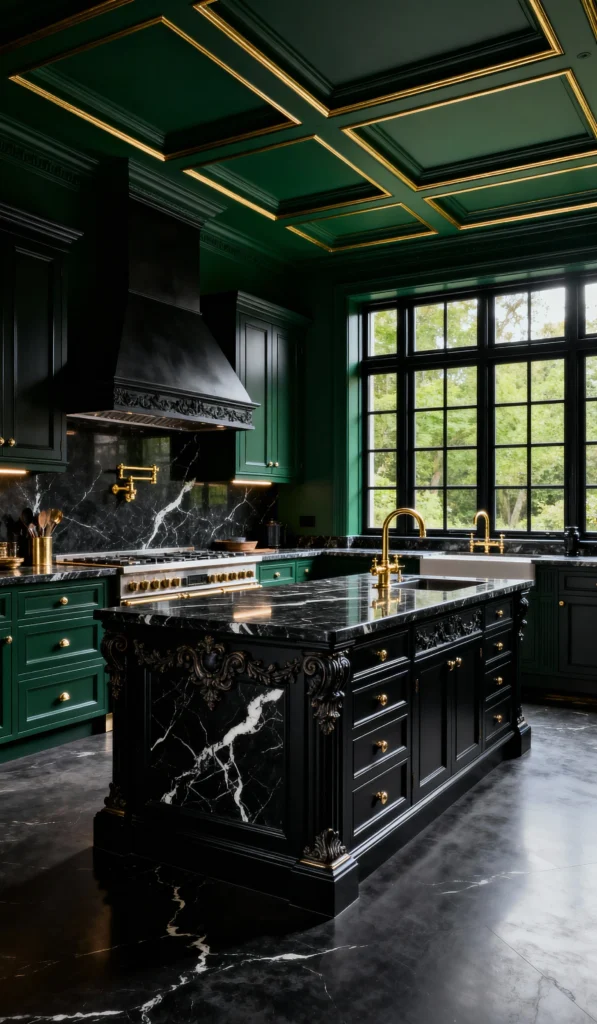If a kitchen could wear a crown, it would be this one. The deep, rich forest green cabinets and walls, combined with the elaborate gold trim on the ceiling and the black marble with stark white veining, create an atmosphere of pure, opulent drama. The intricately carved black island is a masterpiece! It’s moody, grand, and totally over the top in the best possible way. This is the pinnacle of dramatic, luxurious design.