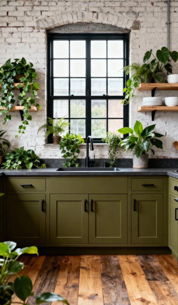 This is what I call effortlessly cool. The muted olive green cabinets are the perfect grounding color against the exposed, distressed white brick wall. The raw wooden shelves and the rustic floorboards add a cozy, industrial charm. Of course, the lush collection of houseplants—the real green stars of the show—make the whole space feel fresh and incredibly welcoming. This is urban farmhouse chic done right.