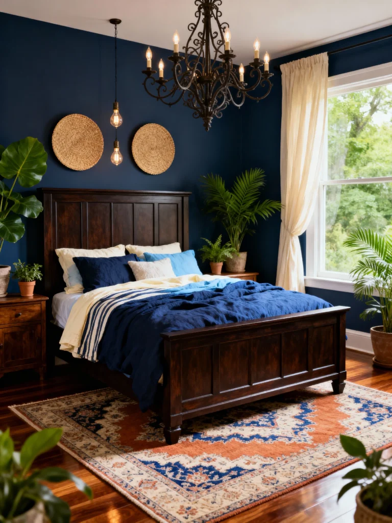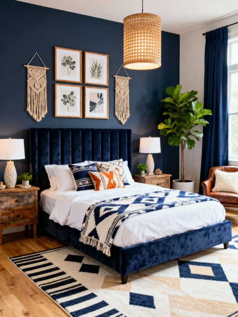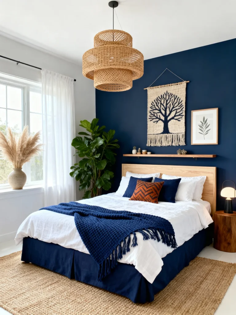 If you’re nervous about painting a room a dark color, this is your sign to just go for it! The deep navy accent wall here creates so much depth, but the room stays bright thanks to those crisp white linens and large windows. The wicker tiered chandelier is the absolute star of the show—it adds that organic, “high-end boutique hotel” feel. I love how the simple tree tapestry brings in a bit of nature without being overwhelming. It’s clean, it’s fresh, and it looks like the perfect place to wake up on a Saturday morning.