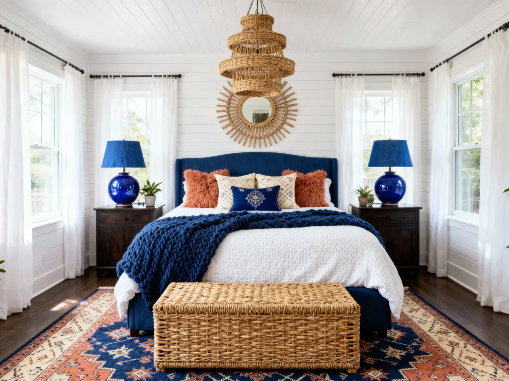 Finally, we have a room that flips the script with white shiplap walls. If you love blue but don’t want dark walls, use blue as your accent color! The cobalt blue lamps and the navy velvet bed frame provide all the drama you need against the white backdrop. The sunburst mirror and the tiered woven light fixture keep that boho thread running through. It’s bright, airy, and super cheerful.