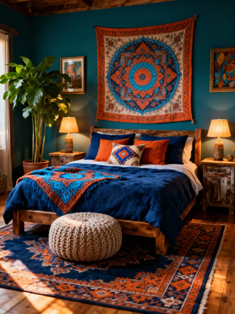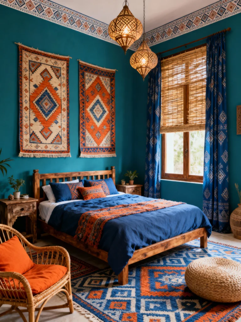 This room feels like a vacation in Marrakesh! The teal-blue walls are so vibrant, and those geometric tapestries hanging above the bed add such a cool, global touch. Check out the detail on the ceiling trim—that’s a pro tip for making a room feel custom. The mix of burnt orange and deep blue is a classic color theory win (complementary colors for the win!). It’s cozy, eclectic, and full of personality. If you want a room that tells a story, this is the blueprint.