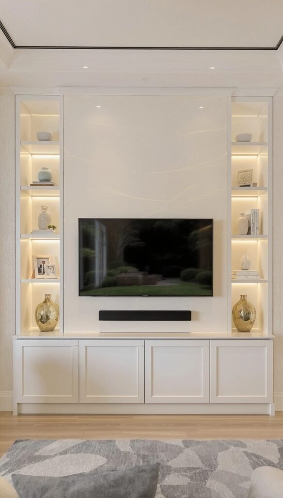 How chic is this! The bright white cabinetry and recessed shelving create a beautiful, built-in look. The backlighting in the niches is perfect for highlighting your favorite decor, adding a warm glow that makes the whole setup feel sophisticated and custom-made. It’s clean, organized, and totally elevates the room.
