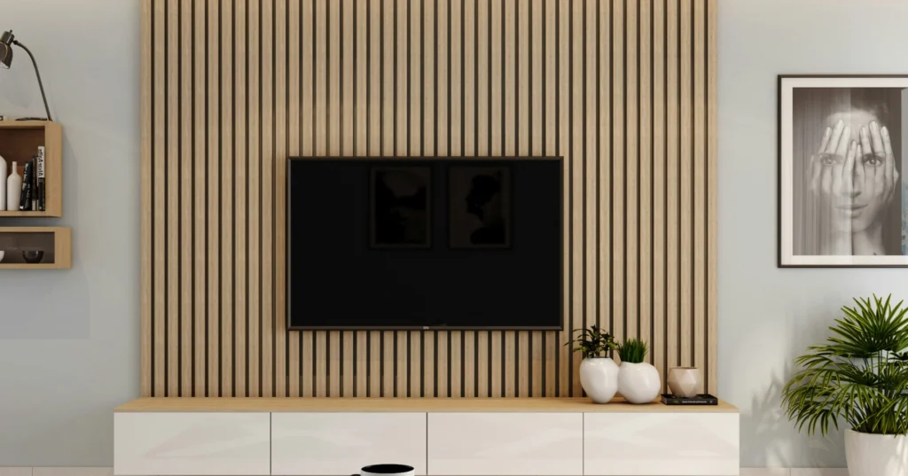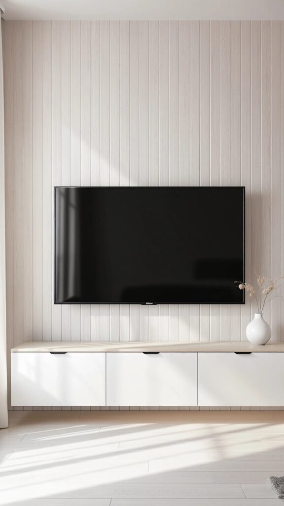 This is the classic wood slat wall done right! The natural wood tone is warm and inviting, providing a fantastic, textured background that makes the TV seem less obtrusive. Paired with a simple floating white console and some greenery, it’s a perfect blend of modern style and natural coziness.