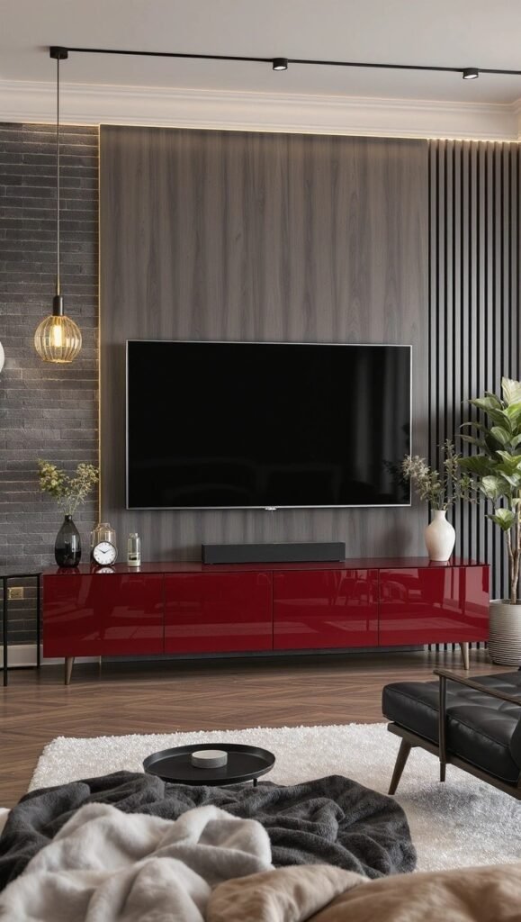 Talk about drama! The rich, dark wood paneling provides an elegant backdrop, but that high-gloss crimson media console is the real star here. It grounds the entire setup and adds a luxurious, modern flair. The ambient lighting strip and the exposed brick on the side complete this cozy, sophisticated vibe.