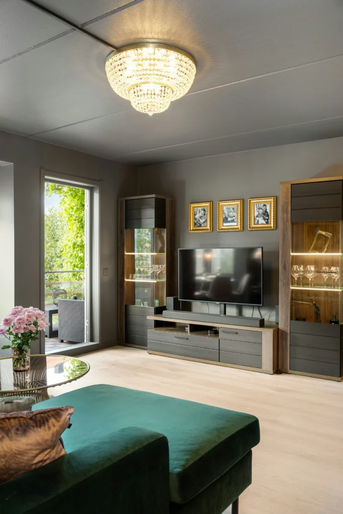 If you love a more traditional or cozy look, check this out. The handsome dark wood and gray storage units flank the TV, giving you tons of space to tuck things away. The matching wood accents on the console tie it all together, and the layered gold frames add a touch of glam.