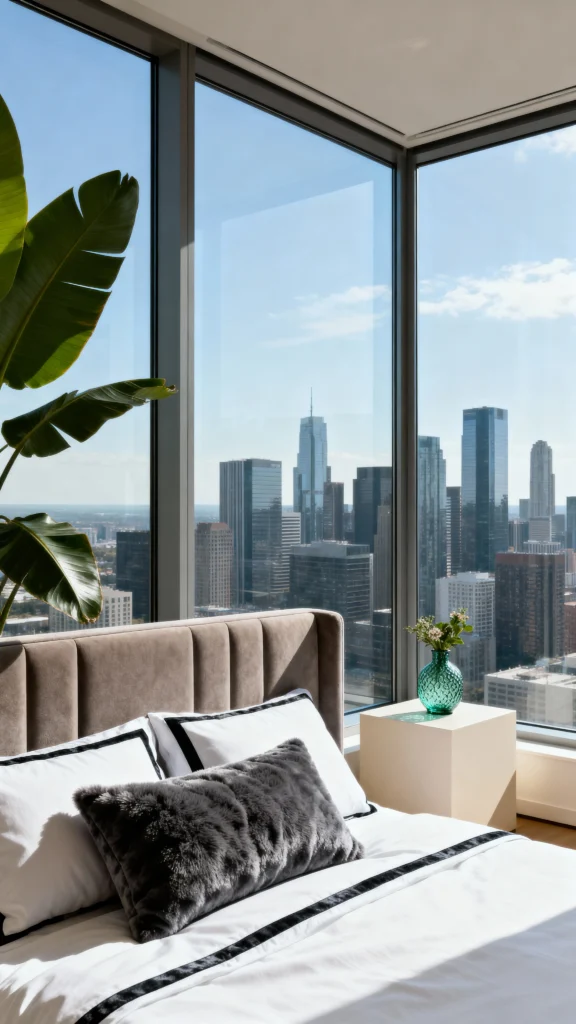 Can you imagine waking up to this? The floor-to-ceiling windows bring the entire skyline right into your space—talk about a spectacular view! The plush, neutral headboard and simple white bedding with black trim keep the focus firmly on that amazing backdrop. A subtle green glass vase adds a pop of color that complements the large, lush plant on the left. This room is the definition of sophisticated urban living.