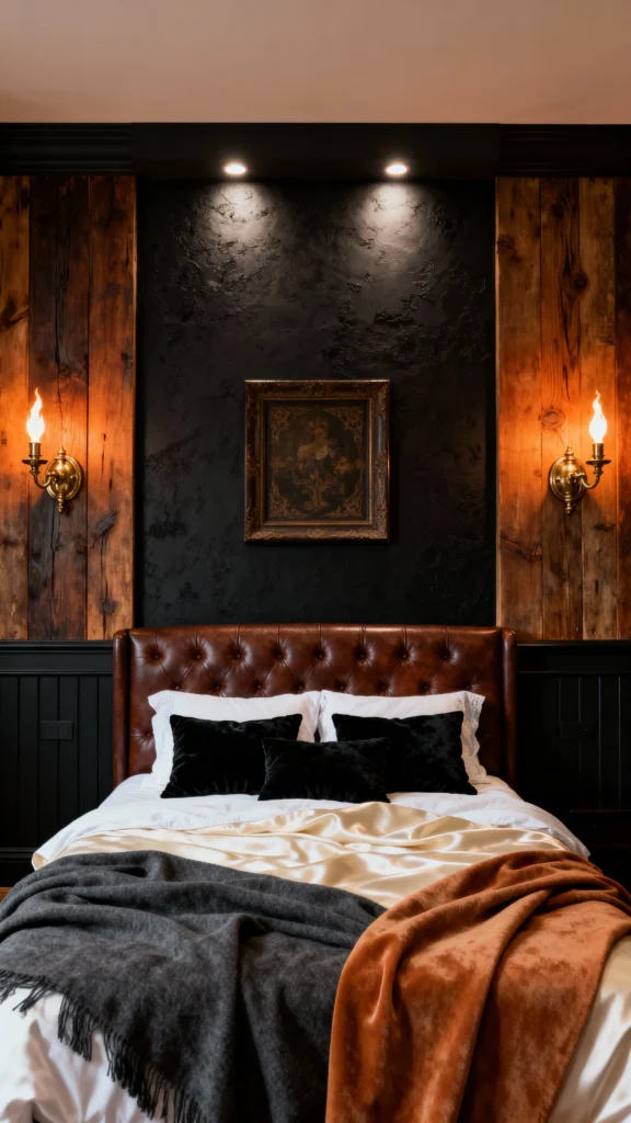 This room is giving me serious upscale cabin vibes! The contrast between the dark, textured wall behind the bed and the rustic, warmly lit wooden panels is stunning. That deep brown leather tufted headboard adds a classic, masculine elegance. The antique-style sconces with the faux-flame bulbs are a brilliant touch, creating a truly intimate, romantic atmosphere.