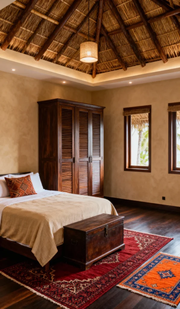 Total vacation goals! The woven, thatched ceiling instantly transports you to a tropical paradise, perfectly complemented by the simple bamboo shade windows. The dark, rich wood of the large wardrobe, bed frame, and chest adds a warm, weighty presence. The layered traditional rugs bring in rich color and pattern, making the whole space feel exotic and inviting.