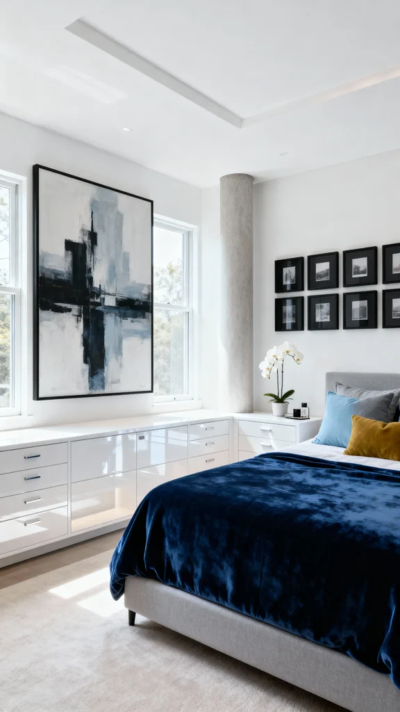 If you love bright, crisp spaces, take notes! This bedroom is flooded with light and features glossy white built-in drawers, making it look incredibly neat. The dramatic, large-scale abstract art piece provides a beautiful contrast against the stark white walls. The splash of color comes from the luxurious, deep-blue velvet duvet, tied together with a few mustard and light blue throw pillows. Super chic and modern.