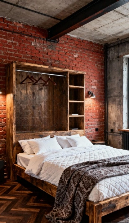 This room has so much character! The exposed red brick and concrete ceiling give it a cool, rugged, industrial loft feel. I love how the dark, richly stained wood bed frame and headboard—which cleverly incorporates shelves and a hanging rack—warms up the space. It’s all about texture here, from the quilted white comforter to the patterned dark brown throw blanket on the bed. Perfect for someone who loves a cozy, rustic edge.