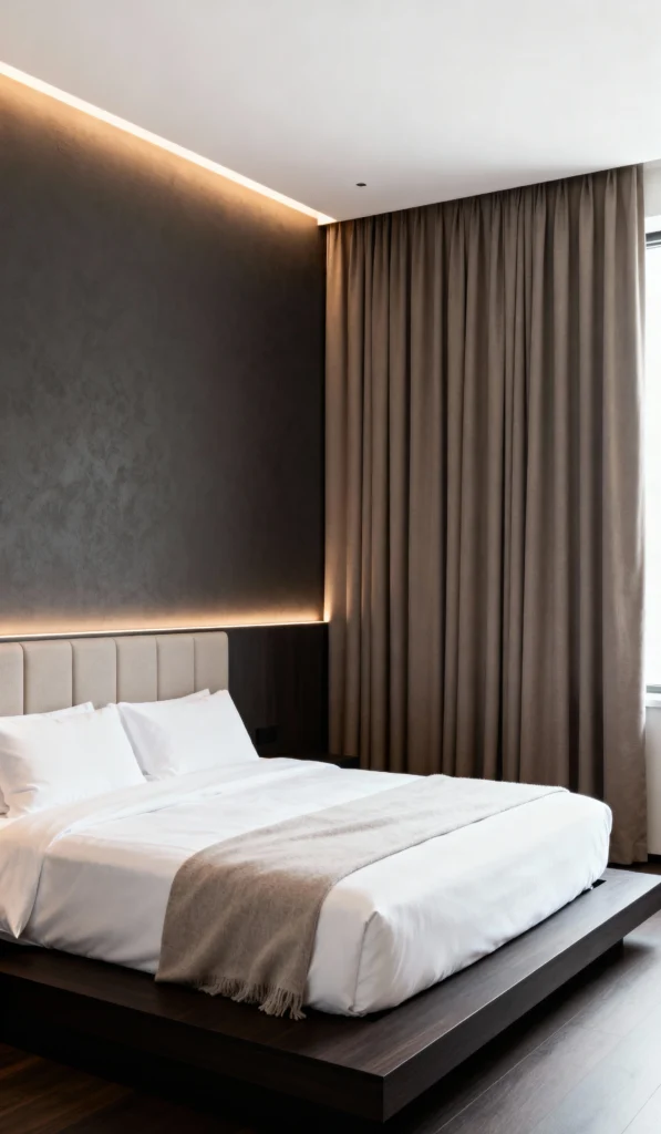 This is the ultimate minimalist retreat. The clean lines of the low, dark wood platform bed make the room feel grounded and spacious. I’m obsessed with the back wall—that dark, textured surface with the hidden LED strip lighting is such a sleek way to add dimension and mood. The neutral curtains and simple, high-quality white bedding keep everything looking sharp and incredibly serene.