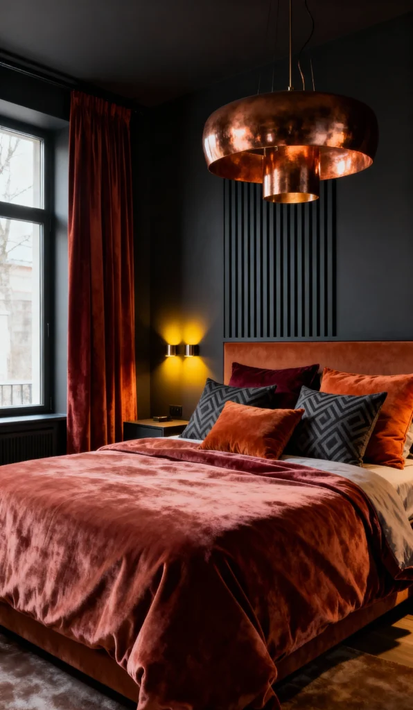 Talk about mood! The deep, dark walls and the rich, rusty copper velvet of the bed instantly create a sense of luxurious drama. That incredible tiered copper light fixture is a total showstopper and casts such a warm glow. Combined with the matching curtains and mix of patterned and solid jewel-toned pillows, this bedroom is an opulent, cozy retreat that feels perfect for a boutique hotel stay.