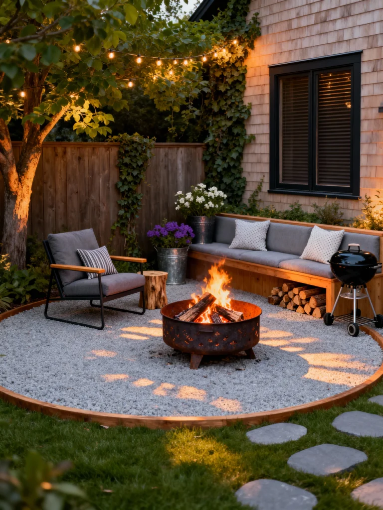 There is something so intentional about a circular gravel patio. It feels like its own little “room” without any walls. I love how this setup uses a simple wood border to keep the gravel tidy against the lawn. The built-in wooden bench is a total space-saver, and that little nook underneath for firewood? Pure genius. It’s the perfect spot for a Tuesday night glass of wine or roasting marshmallows with the kids. It’s casual, approachable, and looks like it smells like cedar and woodsmoke.