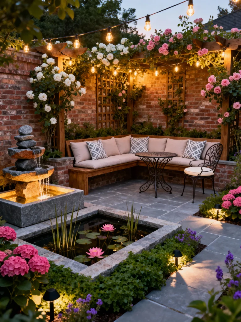 If you want to feel like you’ve stepped into a European villa, this is your blueprint. The combination of the brick walls and that tiered stone fountain is so romantic. But honestly, the real stars here are the climbing roses. Imagine sitting on that L-shaped bench with the sound of trickling water and the smell of fresh blooms. The string lights overhead make it feel intimate even after the sun goes down. This isn’t just a patio; it’s a place to hide away from the world.