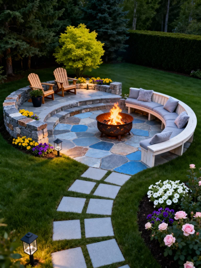 I’m obsessed with the geometry here. The way the flagstone path leads right into that sunken fire pit area is so inviting. It’s got a very “clean” look, especially with that curved white bench that follows the line of the stone wall. It’s a great example of how to use a corner of a large lawn to create a focal point. Plus, that bright yellow tree in the background adds the perfect pop of color against the dark green hedge. It feels fresh, bright, and very “summer evening.”
