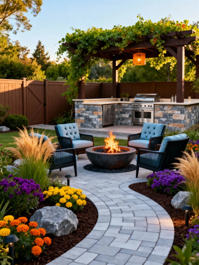 Okay, if you’re the person who is always manning the grill, this one is for you. This isn’t just a BBQ; it’s a full-on outdoor kitchen! The stonework on the island is gorgeous and ties in perfectly with the pavers. I love that they didn’t just stop at the kitchen—they added those plush blue chairs around a fire bowl right next to it. It’s the ultimate entertaining layout because the cook can still be part of the conversation while the steaks are sizzling.