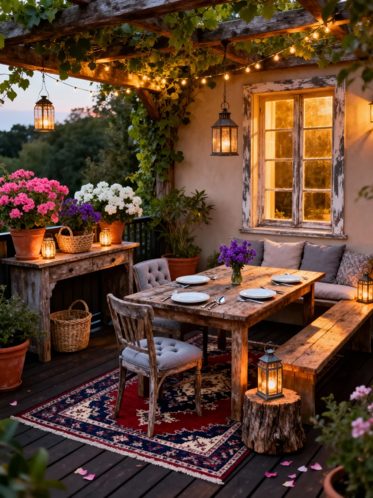 This looks like the setting for a long, slow Sunday dinner. The weathered wood table and the traditional rug underneath give it such a lived-in, “shabby chic” vibe. It’s covered by a pergola with actual grapevines (or climbing ivy), which provides the best kind of natural shade. The lanterns scattered around the table and the side console create a warm, golden glow that makes everything look a little bit magical. It’s cozy, cluttered in the best way, and feels like home.