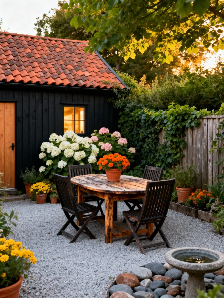 You don’t need a massive deck to create a vibe. This pea-gravel area next to the black garden shed is so charmingly simple. It’s got a “Nordic cottage” feel with the dark wood and the bright orange flowers. The birdbath in the foreground is a sweet touch that brings in some local wildlife. This is exactly where I’d want to sit with a laptop or a good book on a Saturday morning. It’s proof that a small corner and some well-placed pots can do wonders.