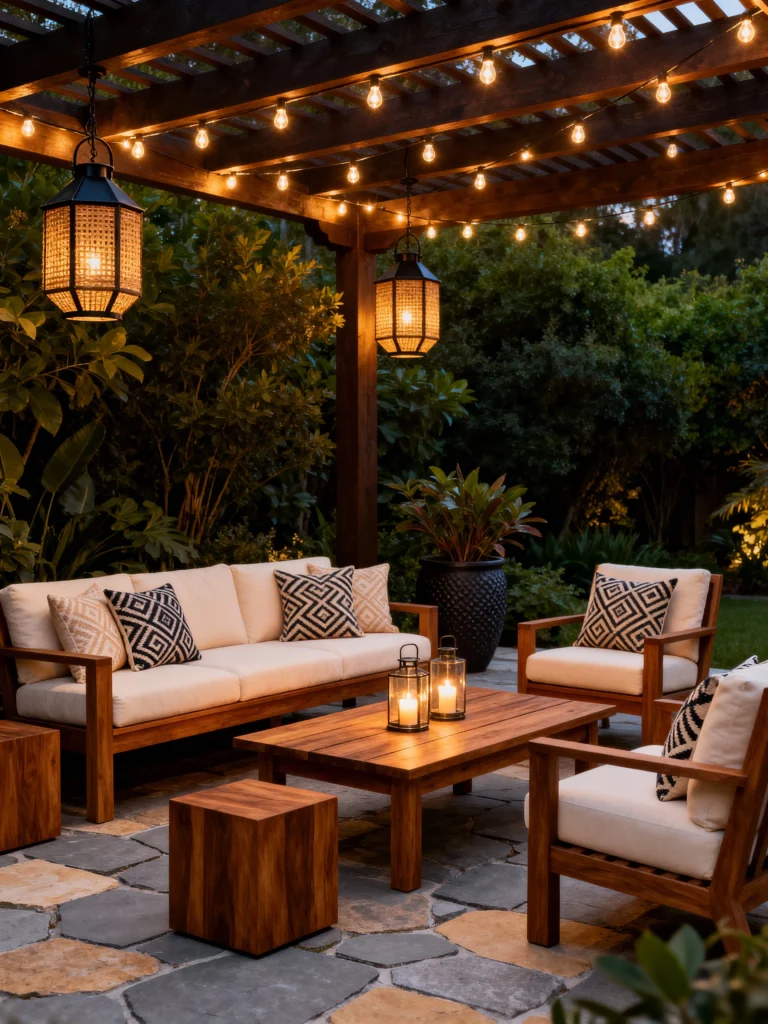 Can we talk about these lanterns? Hanging oversized woven pendants under a pergola is such a great way to make an outdoor space feel like a high-end living room. The teak furniture with those geometric pillows looks so high-end but still comfortable. This setup is all about texture—the wood, the stone, the soft cushions, and the surrounding tropical greenery. It’s a very “resort-style” vibe that you could totally recreate in a standard backyard.
