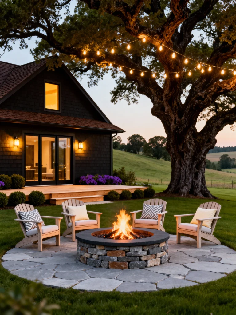 That massive oak tree is doing a lot of the heavy lifting here, but the design is what makes it shine. Using string lights to mimic the “canopy” of the tree branches is a brilliant move. The stone patio around the fire pit is simple and rugged, which fits the wide-open landscape perfectly. The Adirondack chairs are the classic choice here—they’re comfortable, timeless, and just scream “vacation mode.” It’s simple, open, and lets the natural beauty of the land do the talking.