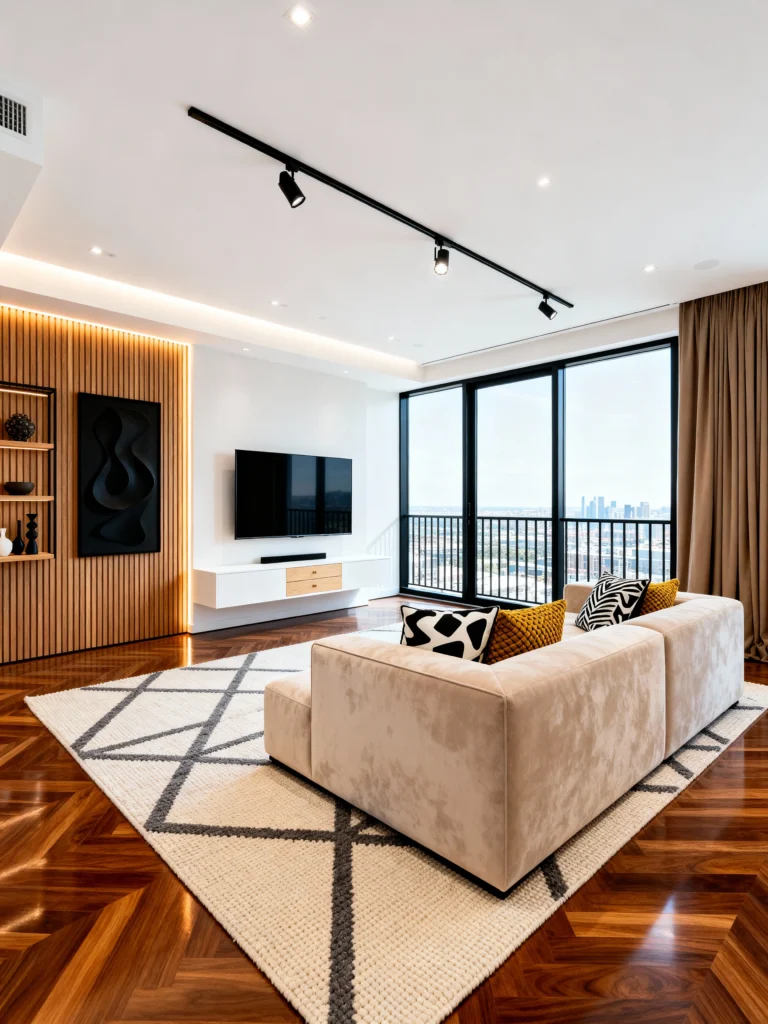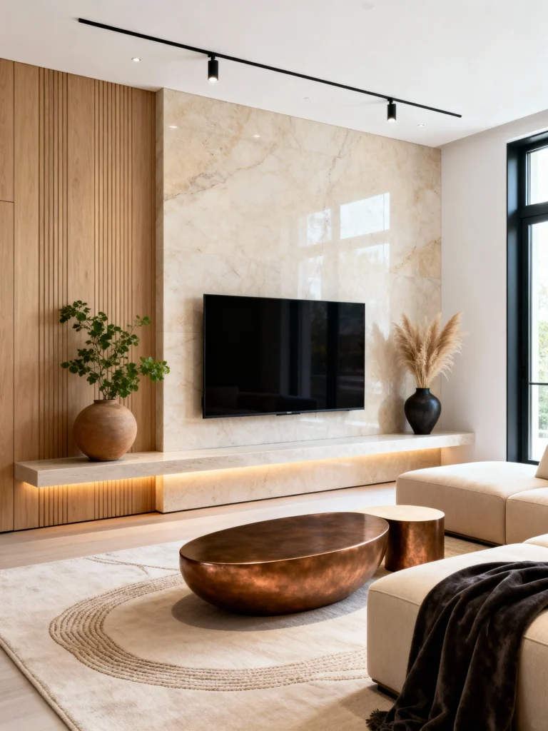 This is “quiet luxury” at its finest. The massive stone-slab feature wall behind the TV is absolutely breathtaking—it brings a natural, organic element that feels very expensive. To keep it from feeling too cold, they’ve paired it with vertical wood slats and warm under-shelf lighting.