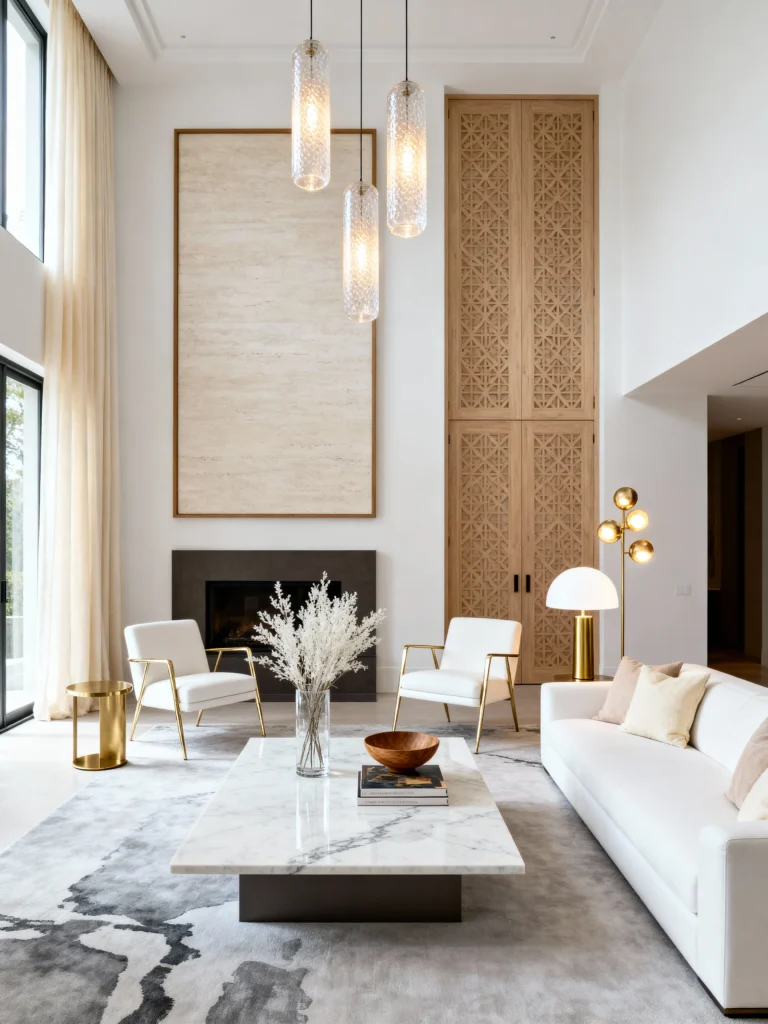 This room is all about height and light. The floor-to-ceiling windows and the massive, oversized artwork above the fireplace make the space feel absolutely huge.