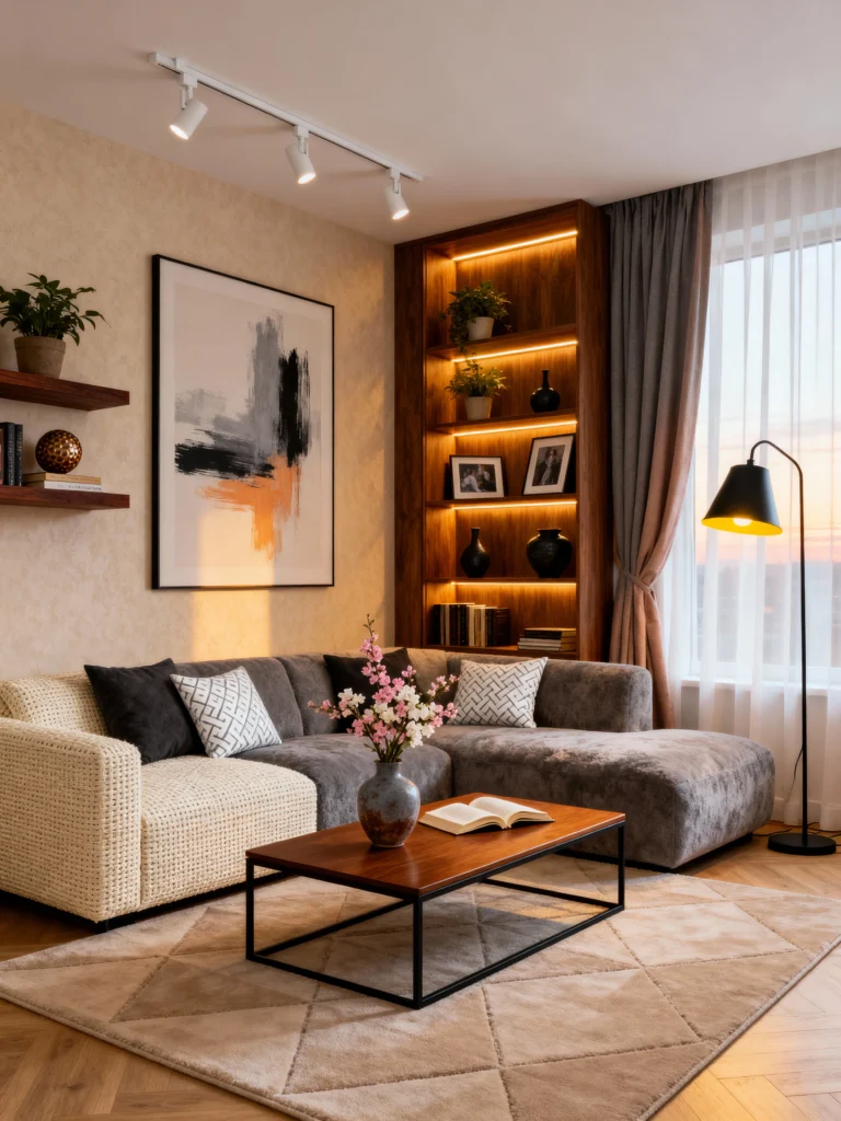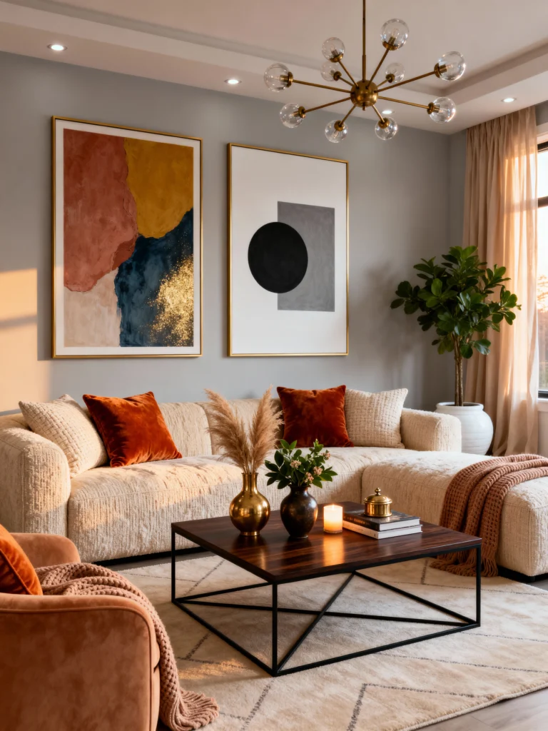 One of my favorite details here is the coffee table. It’s a simple dark wood square, but the way it’s styled with gold vases and candles makes it look so intentional. Using two large, matching frames for the abstract art above the sofa is also a great way to fill a big wall without it looking messy. It’s symmetrical, calm, and very inviting.