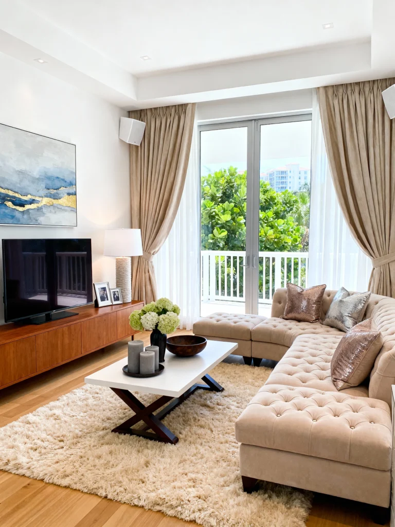 I love how the heavy tan drapes frame the balcony view—it almost looks like a luxury hotel suite. If you’re looking to make a smallish room feel grand, a large-scale piece of art like the blue and gold one above the TV is a pro move. It draws the eye up and makes the ceilings feel miles high.