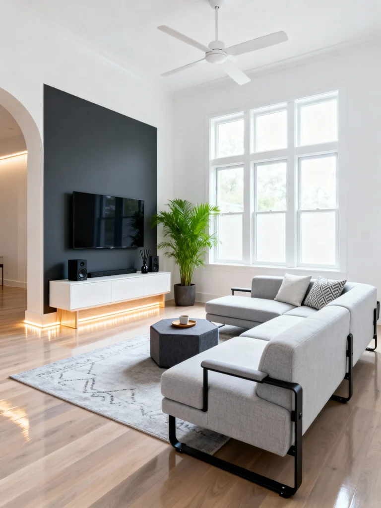 If you’re a fan of the “ultra-modern” look, this one is for you. The focal point here is definitely that bold, charcoal-grey accent block behind the TV. It creates so much depth against the white walls. It’s a brave choice, but it totally pays off because it anchors the room.