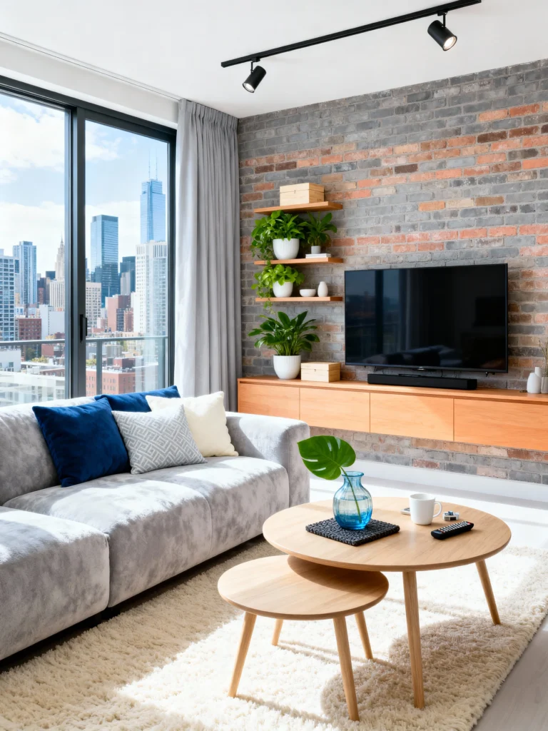Living in the city doesn’t mean your home has to feel cold. This room uses an exposed brick wall to bring in so much character and history. I love the floating wooden shelves tucked into the corner—they’re perfect for showing off a plant collection (and let’s be real, we all need more plants).