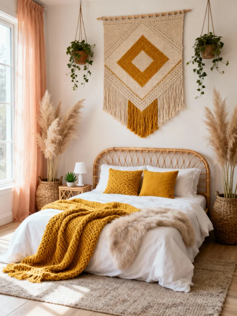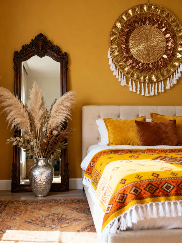 I am absolutely obsessed with the symmetry here! If you’re nervous about bold colors, this is how you do it right. The large woven wall hanging acts as a focal point without being overwhelming. Notice how the chunky knit throw in that deep mustard yellow adds so much texture? It makes you want to just dive right in. The use of pampas grass on both sides of the bed creates this soft, ethereal frame that feels like a warm hug. It’s cozy, balanced, and perfectly “natural.”