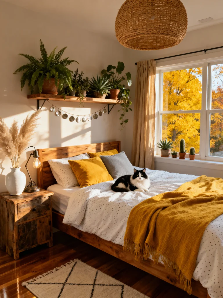 This image feels like a crisp October morning. If you have a cat, you know they are the ultimate judge of “cozy,” and this kitty looks very happy! The wooden shelf above the bed is a genius way to display a plant collection if you’re short on floor space. The lighting here is everything—the warm glow from the Edison bulb lamp against the fall foliage outside the window creates an atmosphere that’s 100% pure hygge.