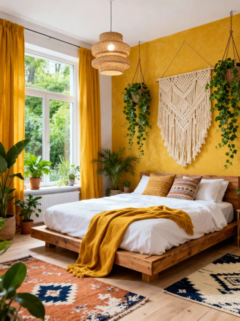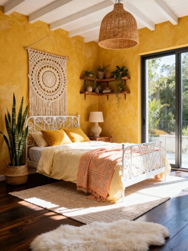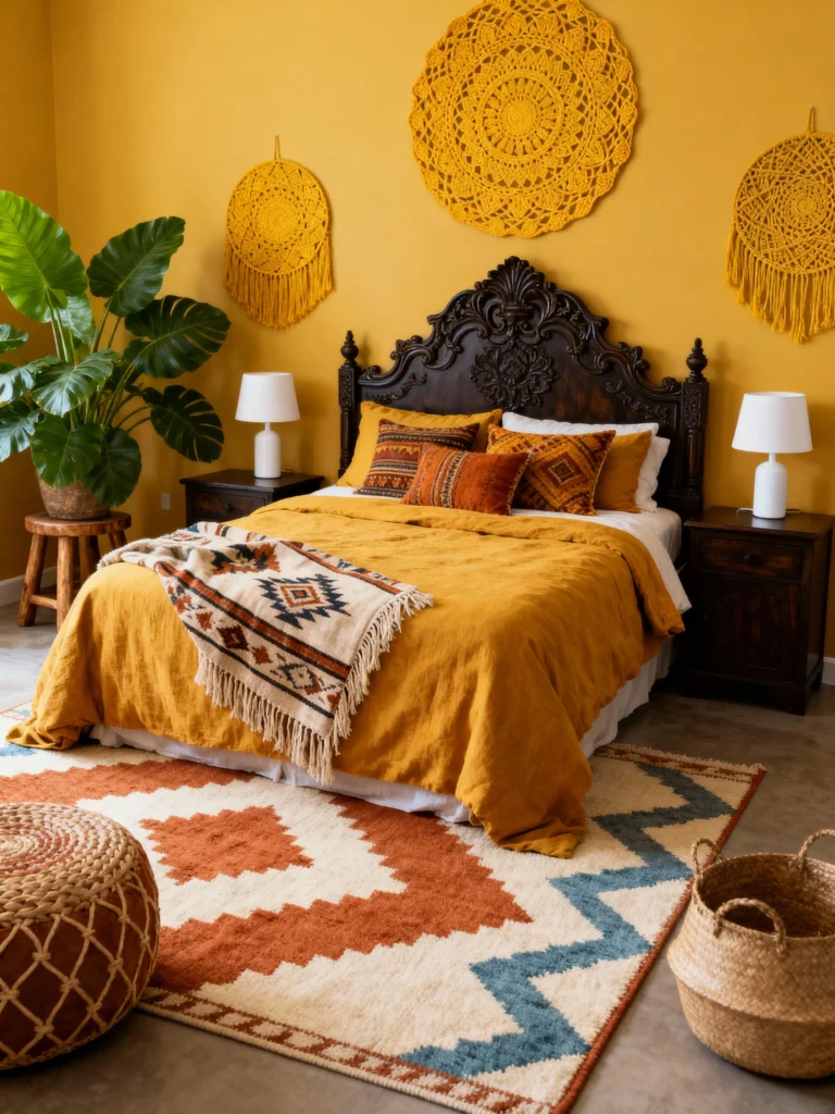 This is “Boho-Chic” with a sophisticated edge. The dark, ornate wooden headboard provides a heavy, grounded contrast to the bright yellow walls. It feels a bit more “maximalist” and worldly. The geometric rug with the pops of blue and terracotta adds a tribal feel that ties all the colors together. It’s a great example of how you can mix dark, heavy furniture with bright, bohemian accents for a look that feels expensive and lived-in.