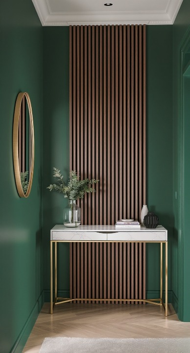 That deep emerald green paired with the walnut wall paneling is an absolute showstopper! This entryway is so sophisticated. The vertical slats draw your eye up, making the space feel taller, and the slim gold-framed console table and oval mirror add a touch of polished elegance. It’s a perfect balance of texture, color, and glamour.