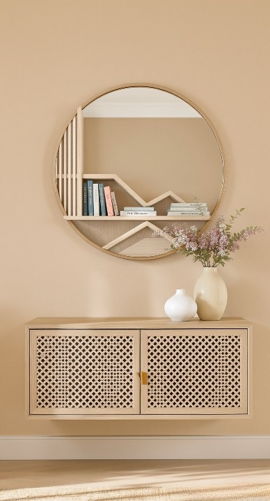 This is a beautiful example of a modern bohemian aesthetic. The floating wooden cabinet with a woven cane front brings warmth and texture. It’s perfectly complemented by the circular mirror that incorporates a small, geometric shelving unit. It’s a functional, beautiful, and space-saving solution for any room.