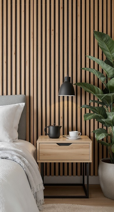 This bedside setup just screams “relax and recharge.” Once again, the vertical wood slats create a stunning feature wall that adds depth and makes the space feel instantly more luxurious. The simple, light-wood nightstand with its black metal base is the perfect spot for a morning cup of tea. Combined with the hanging pendant light and that beautiful, lush bird of paradise plant, it’s the ultimate cozy and chic retreat.