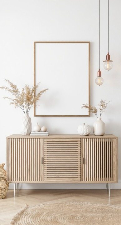I am obsessed with this cabinet! It takes the slat trend and applies it beautifully to furniture, giving it this cool, ribbed texture. Against the crisp white wall, the natural wood tone really pops. The styling is spot-on, too: simple ceramics, subtle lighting, and that gorgeous rounded rug underneath keep the whole look feeling airy and effortlessly put together. A true masterclass in peaceful décor.