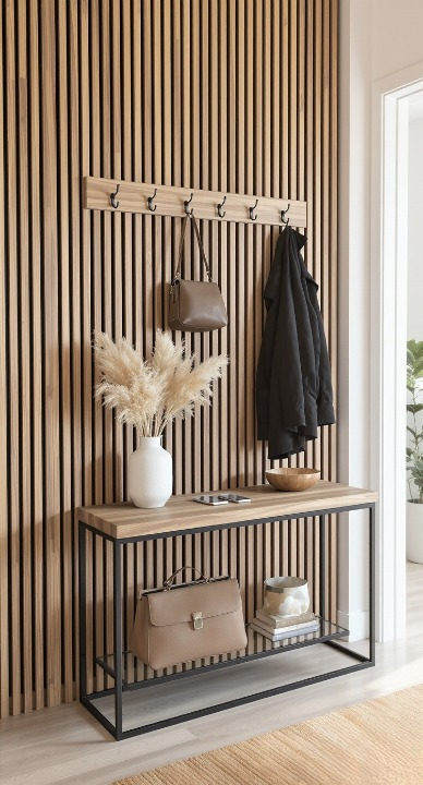 How inviting is this entryway? The vertical wood slat wall is the absolute star, adding incredible texture and warmth without overwhelming the space. The long console table with the black metal frame grounds the area and offers practical storage. Tossing on a coat, grabbing your bag, and seeing the soft pampas grass makes coming home feel instantly relaxing. It’s functional, stylish, and a total mood-booster!
